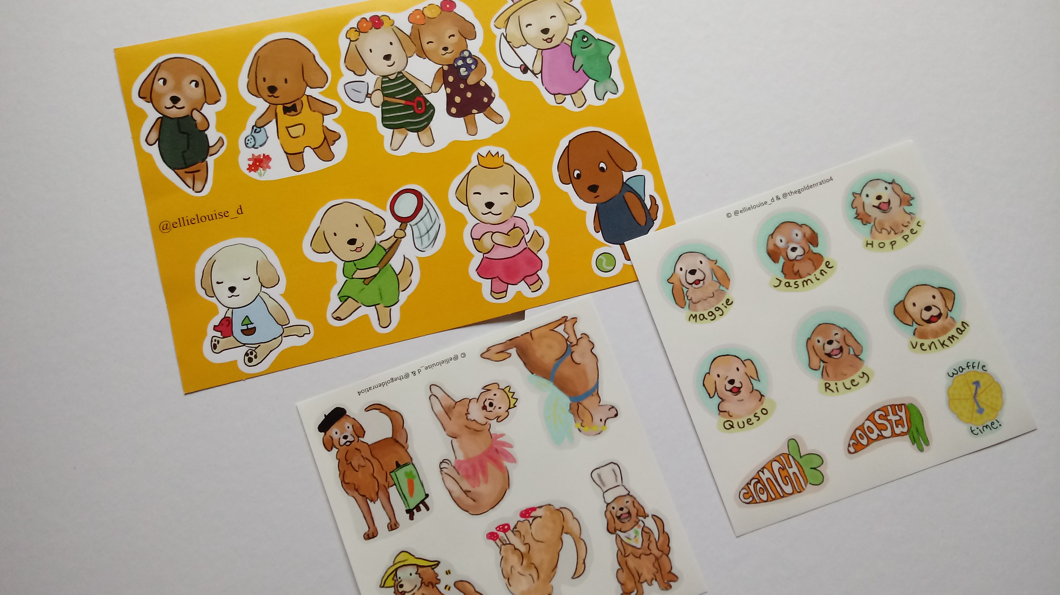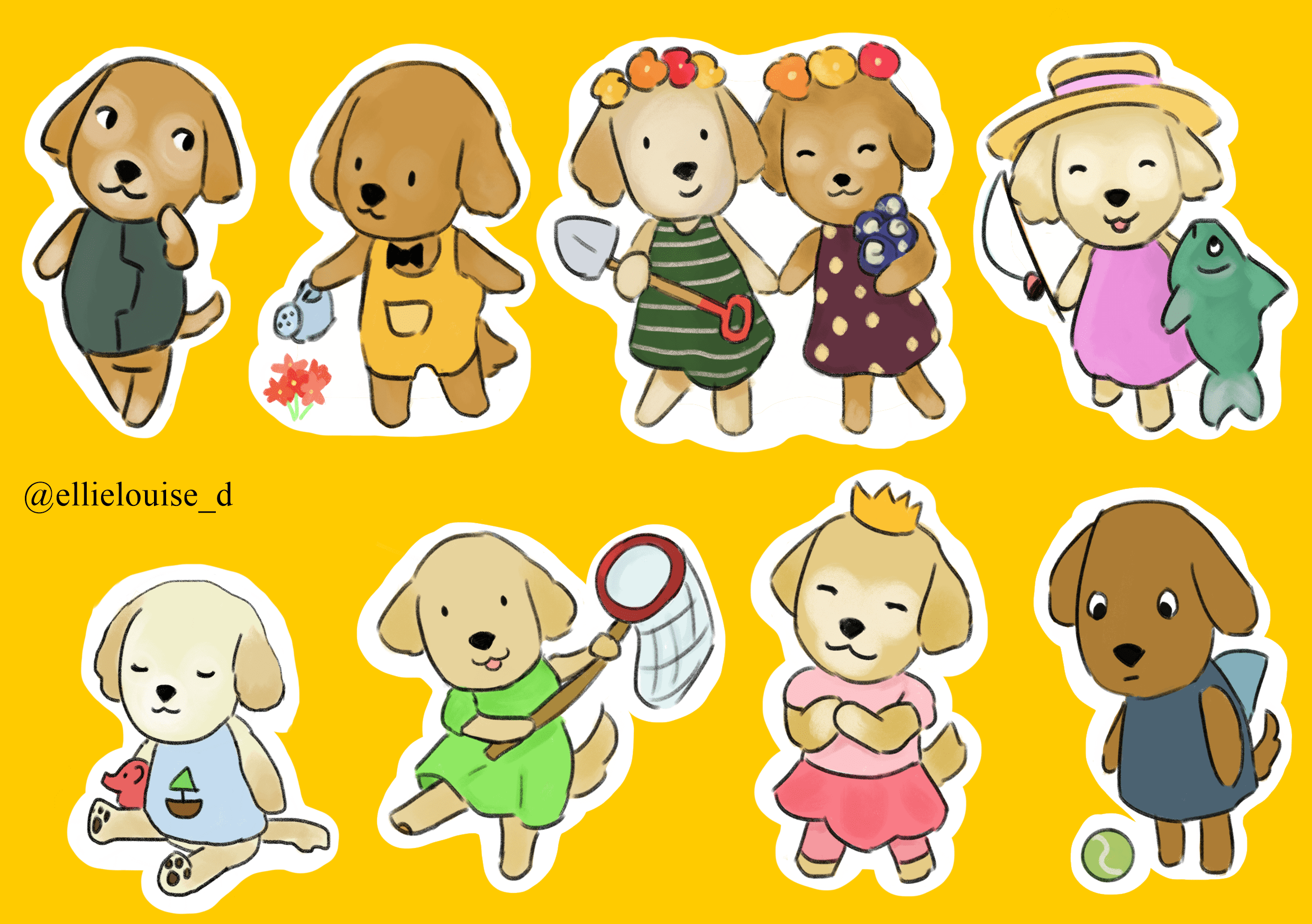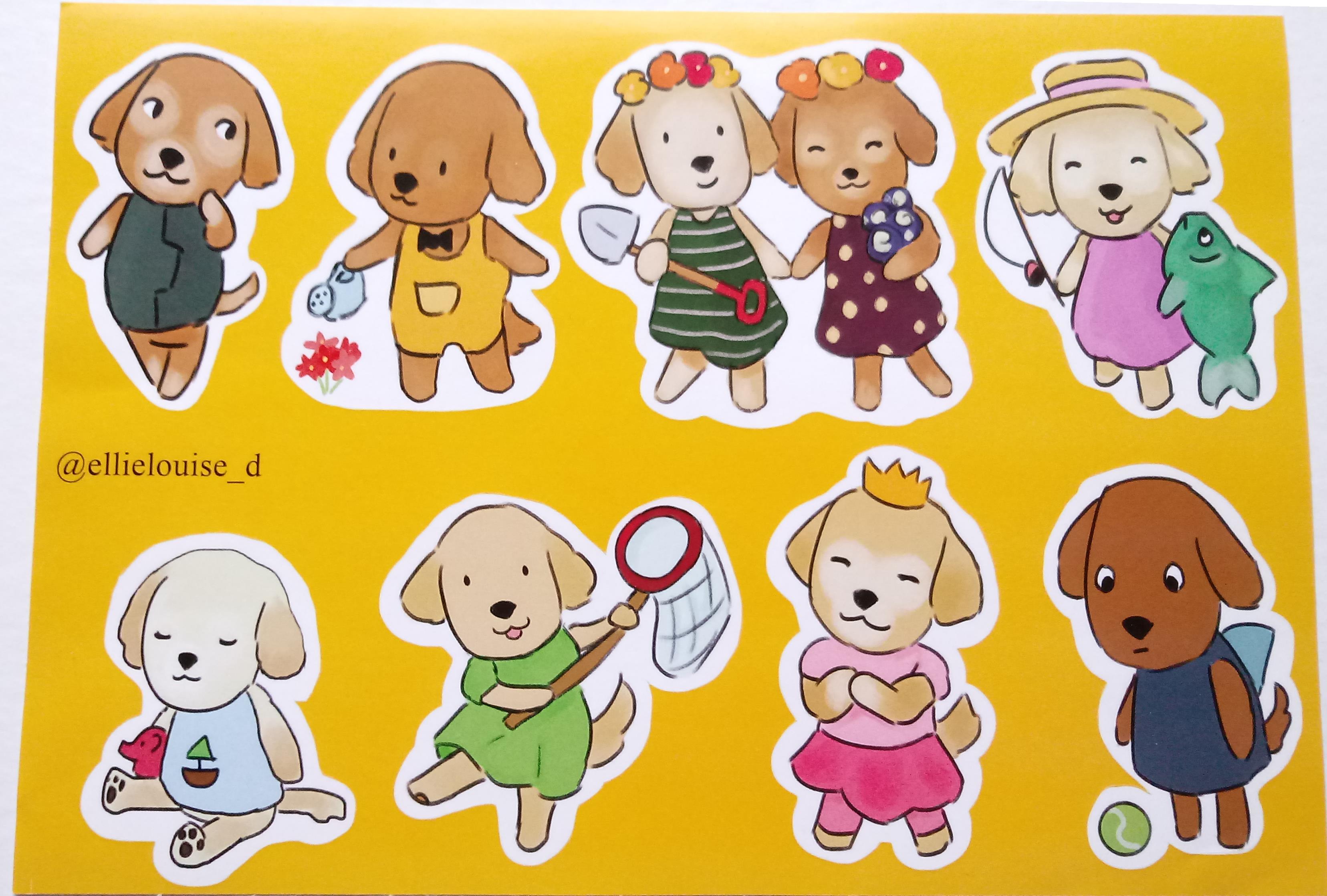 A5 sticker sheet featuring 9 members of @thegoldenratio4 (8 stickers on sheet) themed around fishing, bug catching and fossil hunting