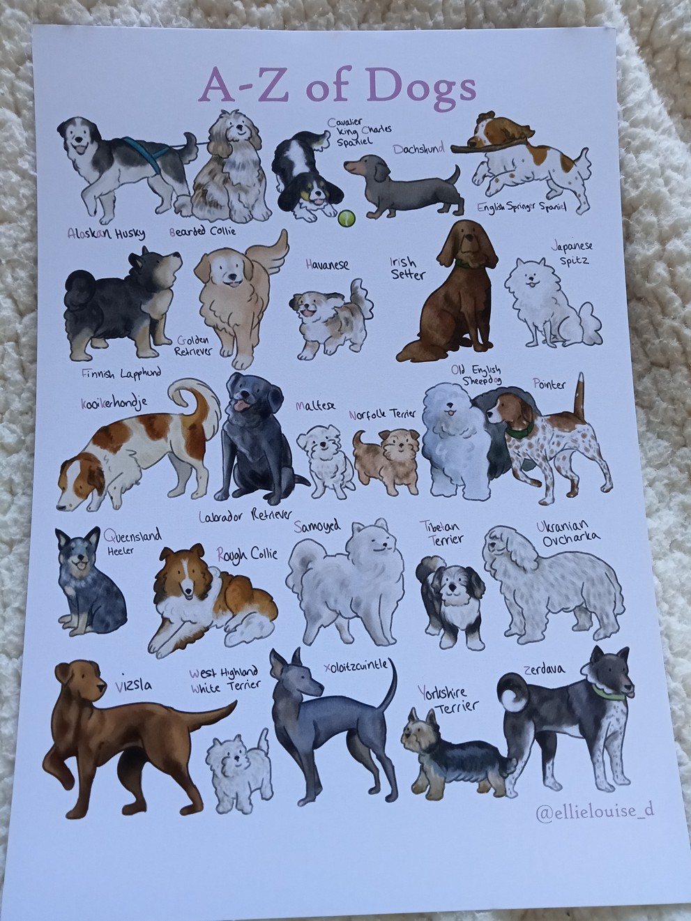 Super fun A4 sized print (21 x 29.7 cm or 8.3 x 11.7 inches) of 26 breeds of dog listed from A-Z!